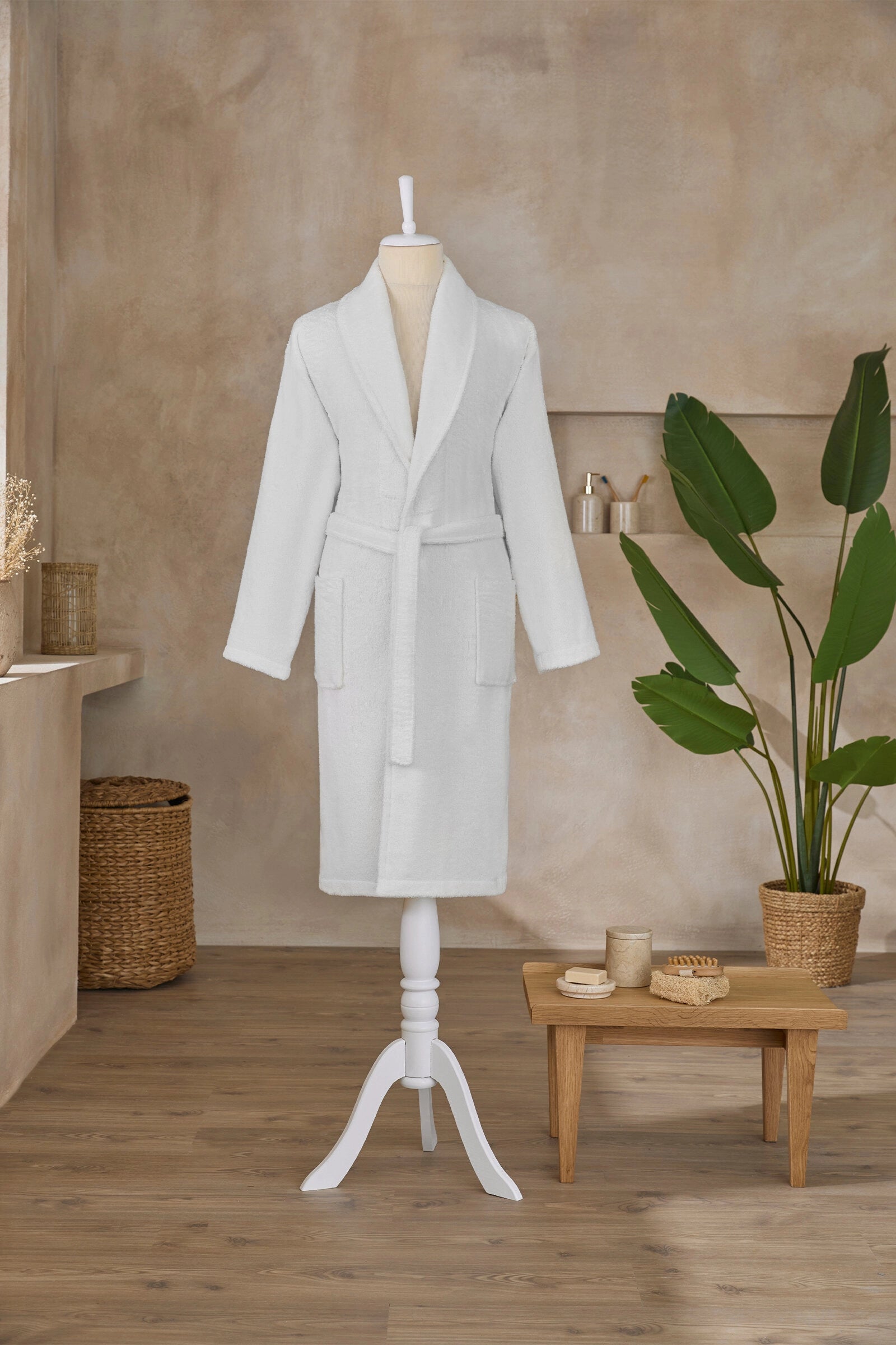 - look modern și unisex: liniile curate și culorile echilibrate fac din acest halat un element versatil și elegant pentru orice spa acasă sau colecție de produse textile premium