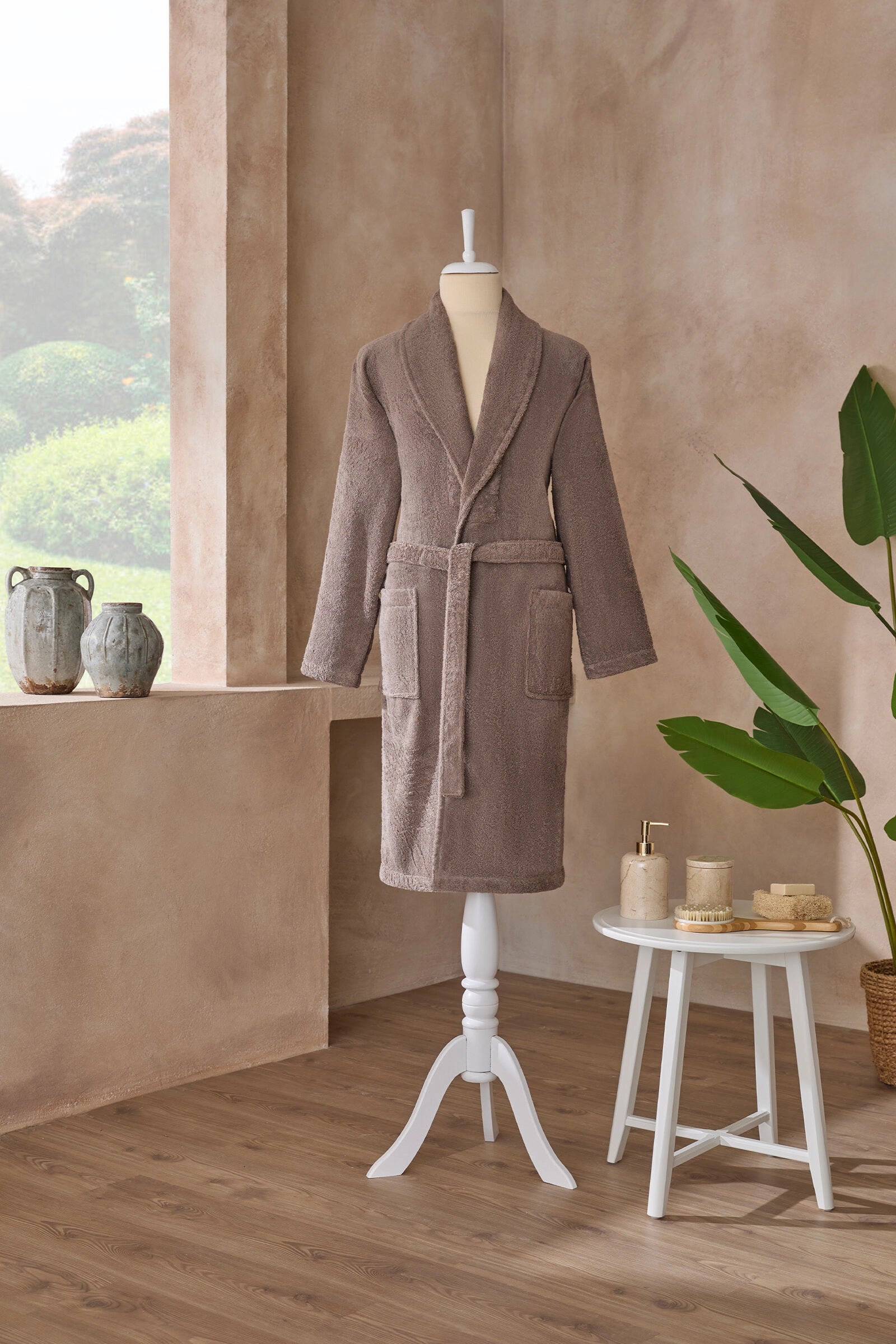 - look modern și unisex: liniile curate și culorile echilibrate fac din acest halat un element versatil și elegant pentru orice spa acasă sau colecție de produse textile premium.
